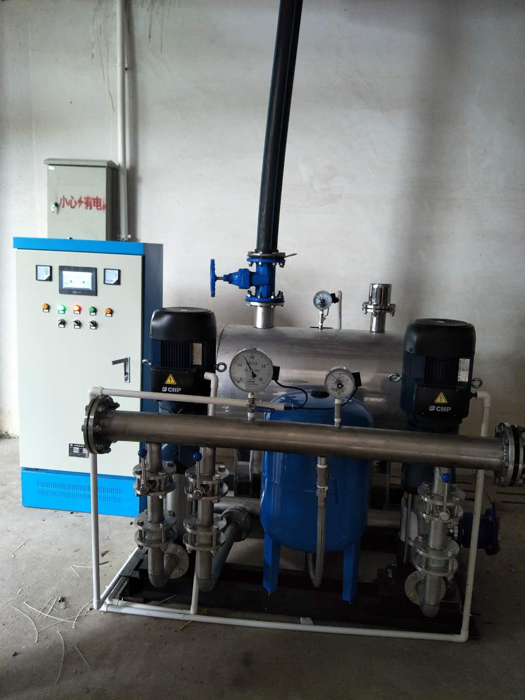 2018.5.14,長和平縣興平水電開發(fā)有限公司第三次與我司合作,簽訂供水設(shè)備購銷合同,用于小區(qū)生活供水,次項(xiàng)目有設(shè)計(jì)院提供設(shè)計(jì)圖紙,我司技術(shù)員根據(jù)現(xiàn)場情況及多年技術(shù)檢驗(yàn)設(shè)計(jì)一套無負(fù)壓變頻供水設(shè)備,型號(hào)ZYW50-50-5.5-2,配兩臺(tái)5.5kw不銹鋼加壓泵,一用一備。